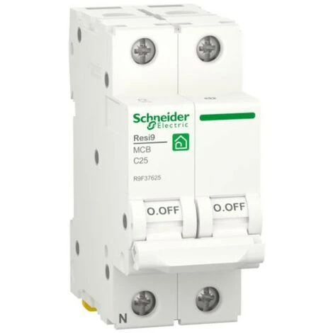 Schneider Resi 9 Disjoncteur magnétothermique 25A, pôles 1P+N, pouvoir de coupure 4,5KA C 2 modules, tension assignée d’isolement 440V, montage DIN (universel pour tout tableau du marché), courbe de déclenchement C.