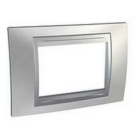 Caractéristiques principales : Gamme de produits : Unica – Design : Unica Top – Type de produit : Plaque – Nombre de modules : 3 modules – Mode de fixation : Clipsable – Teinte de Couleur du cadre : Chrome brillant – Couleur du jonc : Aluminium. Caractéristiques complémentaires : Matière : Partie intermédiaire : ASA + PC / Plaque : zamak – Normes : EN 60669-1 – Largeur : 80 mm – Hauteur : 116 mm – Profondeur : 13.7 mm – Masse du produit : 0.072 kg.
