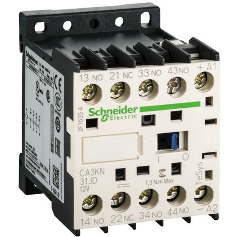 TeSys – contacteur auxiliaire K – CA3K – 3 NO + 1 NF – 10A <= 50°C – AC-15 DC-13 – bobine 12VCC – 600V CSA C22.2 No 14 690V BS 5424 690V IEC 60947 750V VDE 0110 gr C – bornes vis-étrier