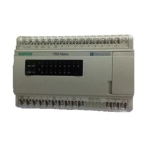 Tensions: 24Vcc. TSX 07 Courant Continu. 9 Entrées et 7 Sorties à relais 2A, horodateur, extensible. Type entrée: isolée. Type sortie: Logique positive.